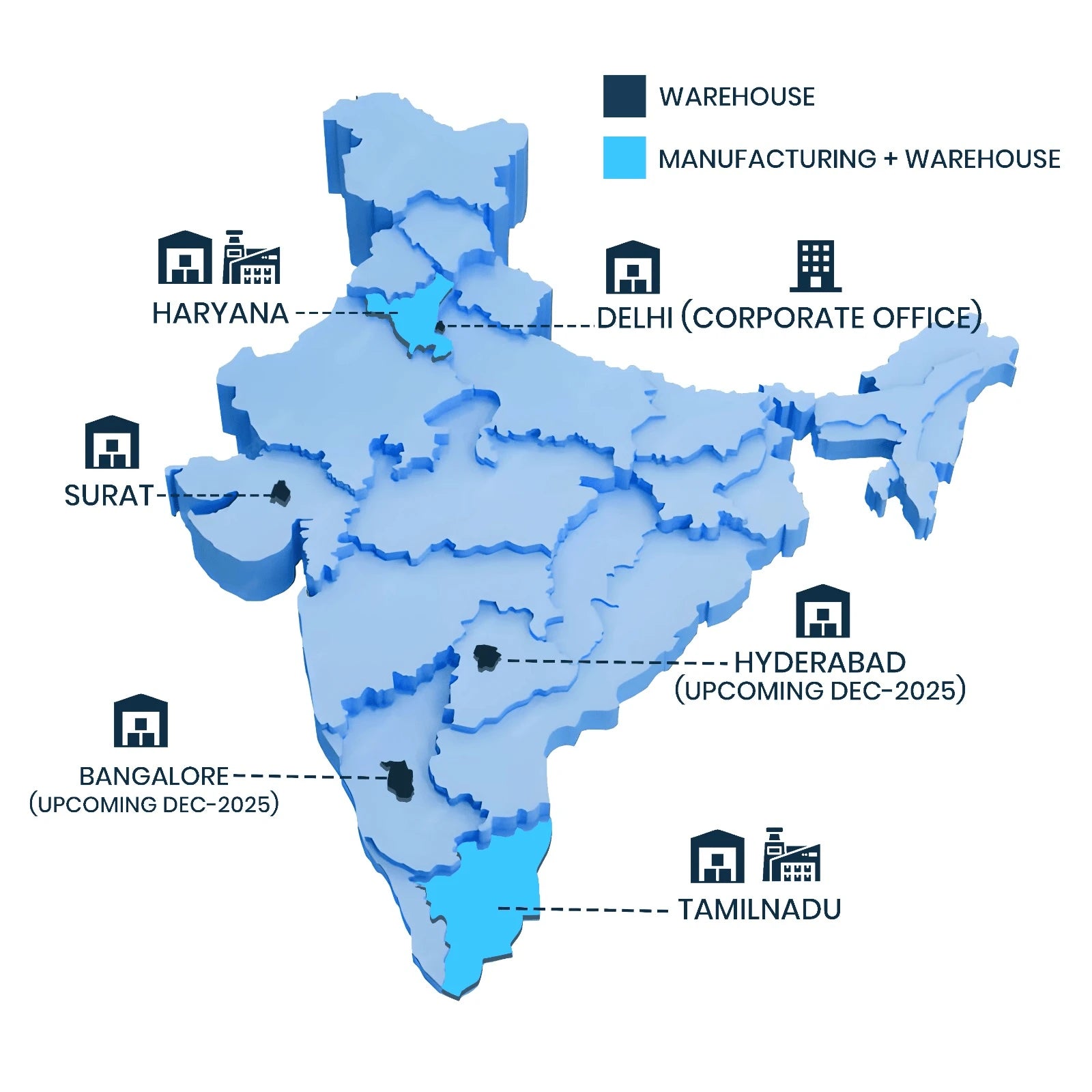 Our corporate headquarters in Delhi anchors our operations, while manufacturing units in Haryana and Tamil Nadu drive innovation and scale. Upcoming facilities in Hyderabad and Bangalore—set to launch in December 2025—will further enhance our ability to meet growing customer demand with agility and precision.